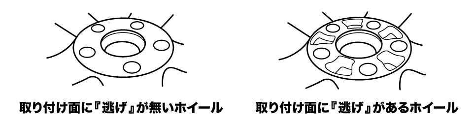 また、ホイールによっては「逃げ」の部分に刻印などが突出している物もございますので、そこに純正スタッドボルトが干渉したりすることがないよう充分にご確認ください。