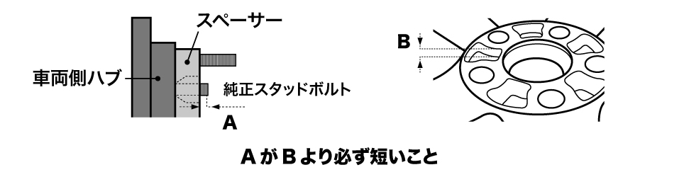 ・「逃げ」があるホイールであっても、純正スタッドボルトのスペーサー表面からの突出分(下図:A)を充分に逃がす深さ(下図:B)が無い場合は絶対に使用しないでください。